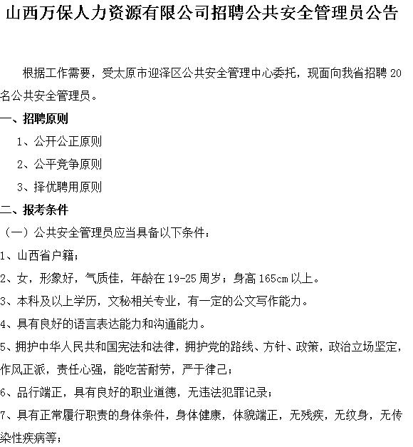 根據工作需要,經市政府批準,現面向社會招聘60名(男35人,女25人)警務輔助人員,派遣至太原市公...